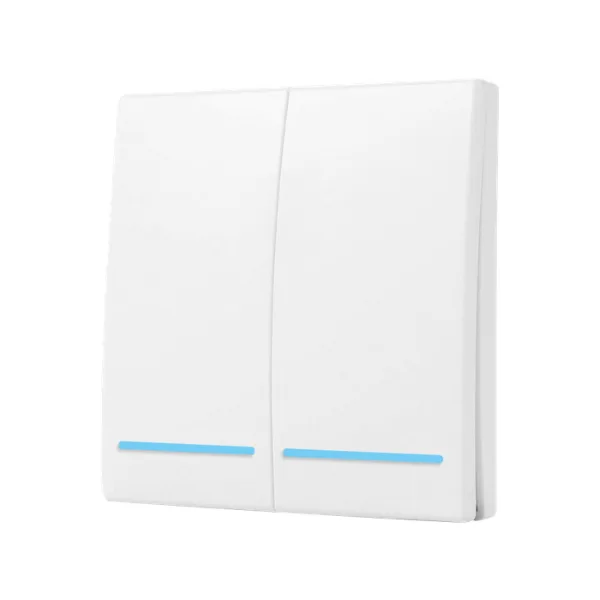 SmartWise RF2 is a 2-gang wireless, RF (radio frequency) based wall switch, with fluorescent line on the switch button (improving switch visibility in the dark).
